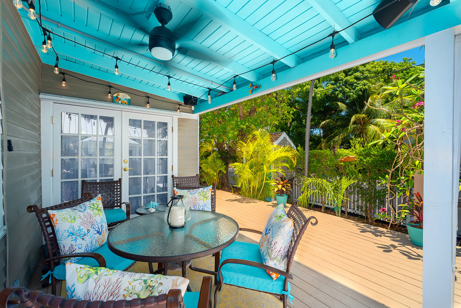 Wrap around Deck with covered area, ceiling fan and café lights